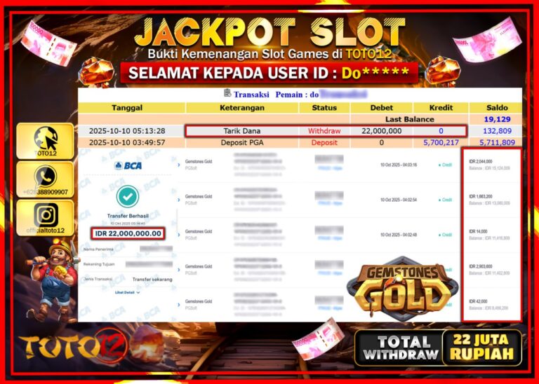 Selamat kepada Member Kami Do****** Telah Jackpot dan berhasil mendapatkan kemenangan besar pada permainan JACKPOT SLOT GAME (GEMSTONES GOLD) Dengan Kemenangan Sebesar Rp.22.000.000 –. Setelah mengisi Fomulir Withdraw dengan Kurang waktu 1-2 Menit Dana sudah kami Trasnfer kepada Pemilik Userid dan dana sudah dapat di cairkan oleh pemenang. Bukti Pembayaran yang TOTO12 berikan merupakan Bukti Pembayaran…