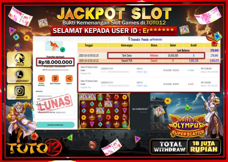 Selamat kepada Member Kami Er****** Telah Jackpot dan berhasil mendapatkan kemenangan besar pada permainan JACKPOT SLOT GAME (GATES OF OLYMPUS SUPER SCATTER) Dengan Kemenangan Sebesar Rp.18.000.000 –. Setelah mengisi Fomulir Withdraw dengan Kurang waktu 1-2 Menit Dana sudah kami Trasnfer kepada Pemilik Userid dan dana sudah dapat di cairkan oleh pemenang. Bukti Pembayaran yang TOTO12 berikan…