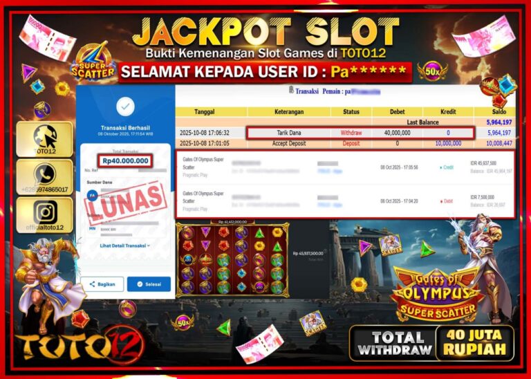 Selamat kepada Member Kami Pa****** Telah Jackpot dan berhasil mendapatkan kemenangan besar pada permainan JACKPOT SLOT GAME (GATES OF OLYMPUS SUPER SCATTER) Dengan Kemenangan Sebesar Rp.40.000.000 –. Setelah mengisi Fomulir Withdraw dengan Kurang waktu 1-2 Menit Dana sudah kami Trasnfer kepada Pemilik Userid dan dana sudah dapat di cairkan oleh pemenang. Bukti Pembayaran yang TOTO12 berikan…