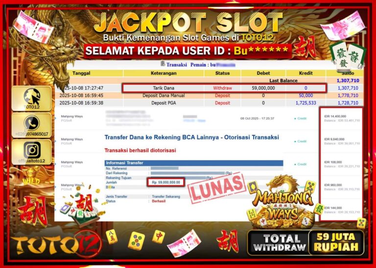Selamat kepada Member Kami Bu****** Telah Jackpot dan berhasil mendapatkan kemenangan besar pada permainan JACKPOT SLOT GAME (MAHJONG WAYS) Dengan Kemenangan Sebesar Rp.59.000.000 –. Setelah mengisi Fomulir Withdraw dengan Kurang waktu 1-2 Menit Dana sudah kami Trasnfer kepada Pemilik Userid dan dana sudah dapat di cairkan oleh pemenang. Bukti Pembayaran yang TOTO12 berikan merupakan Bukti Pembayaran…