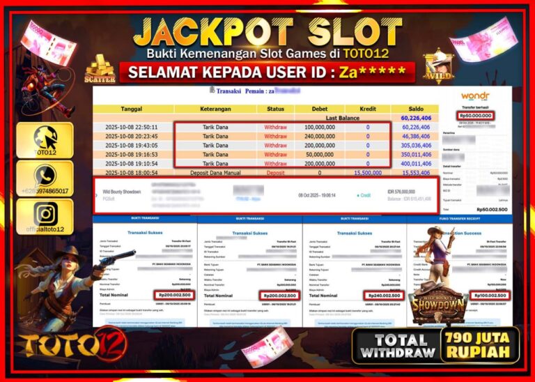 Selamat kepada Member Kami Za****** Telah Jackpot dan berhasil mendapatkan kemenangan besar pada permainan JACKPOT SLOT GAME (WILD BOUNTY SHOWDOWN) Dengan Kemenangan Sebesar Rp.790.000.000 –. Setelah mengisi Fomulir Withdraw dengan Kurang waktu 1-2 Menit Dana sudah kami Trasnfer kepada Pemilik Userid dan dana sudah dapat di cairkan oleh pemenang. Bukti Pembayaran yang TOTO12 berikan merupakan Bukti…