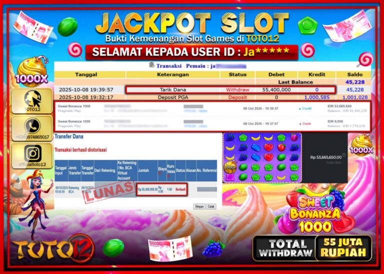 Selamat kepada Member Kami Ja****** Telah Jackpot dan berhasil mendapatkan kemenangan besar pada permainan JACKPOT SLOT GAME (SWEET BONANZA 1000) Dengan Kemenangan Sebesar Rp.55.400.000 –. Setelah mengisi Fomulir Withdraw dengan Kurang waktu 1-2 Menit Dana sudah kami Trasnfer kepada Pemilik Userid dan dana sudah dapat di cairkan oleh pemenang. Bukti Pembayaran yang TOTO12 berikan merupakan Bukti…