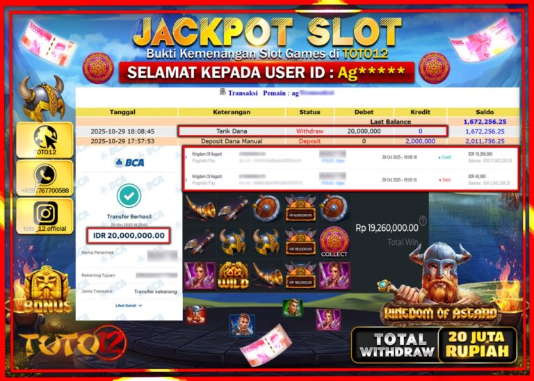 Selamat kepada Member Kami Ag****** Telah Jackpot dan berhasil mendapatkan kemenangan besar pada permainan JACKPOT SLOT GAME (KINGDOM OF ASGARD) Dengan Kemenangan Sebesar Rp.20.000.000 –. Setelah mengisi Fomulir Withdraw dengan Kurang waktu 1-2 Menit Dana sudah kami Trasnfer kepada Pemilik Userid dan dana sudah dapat di cairkan oleh pemenang. Bukti Pembayaran yang TOTO12 berikan merupakan Bukti…