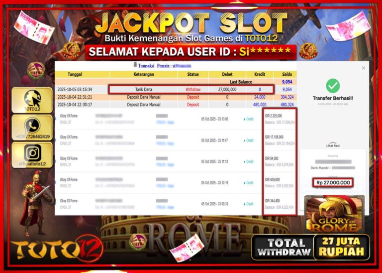 Selamat kepada Member Kami Si****** Telah Jackpot dan berhasil mendapatkan kemenangan besar pada permainan JACKPOT SLOT GAME (GLORY OF ROME) Dengan Kemenangan Sebesar Rp.27.000.000 –. Setelah mengisi Fomulir Withdraw dengan Kurang waktu 1-2 Menit Dana sudah kami Trasnfer kepada Pemilik Userid dan dana sudah dapat di cairkan oleh pemenang. Bukti Pembayaran yang TOTO12 berikan merupakan Bukti…