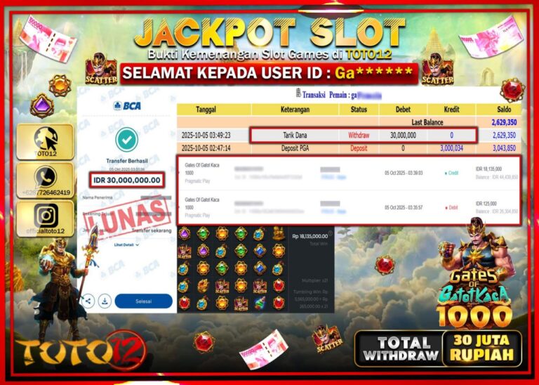 Selamat kepada Member Kami Ga****** Telah Jackpot dan berhasil mendapatkan kemenangan besar pada permainan JACKPOT SLOT GAME (GATES OF GATOT KACA 1000) Dengan Kemenangan Sebesar Rp.30.000.000 –. Setelah mengisi Fomulir Withdraw dengan Kurang waktu 1-2 Menit Dana sudah kami Trasnfer kepada Pemilik Userid dan dana sudah dapat di cairkan oleh pemenang. Bukti Pembayaran yang TOTO12 berikan…