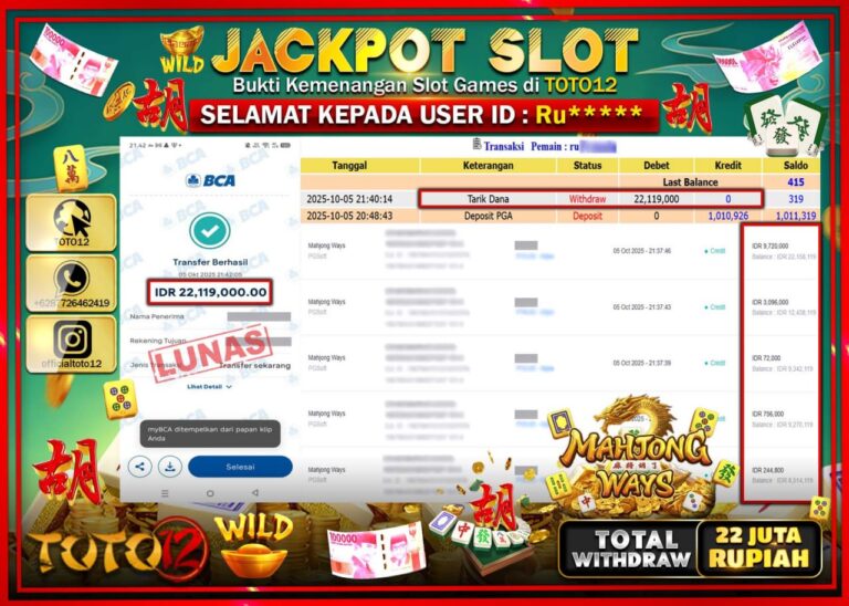 Selamat kepada Member Kami Ru****** Telah Jackpot dan berhasil mendapatkan kemenangan besar pada permainan JACKPOT SLOT GAME (MAHJONG WAYS) Dengan Kemenangan Sebesar Rp.22.119.000 –. Setelah mengisi Fomulir Withdraw dengan Kurang waktu 1-2 Menit Dana sudah kami Trasnfer kepada Pemilik Userid dan dana sudah dapat di cairkan oleh pemenang. Bukti Pembayaran yang TOTO12 berikan merupakan Bukti Pembayaran…