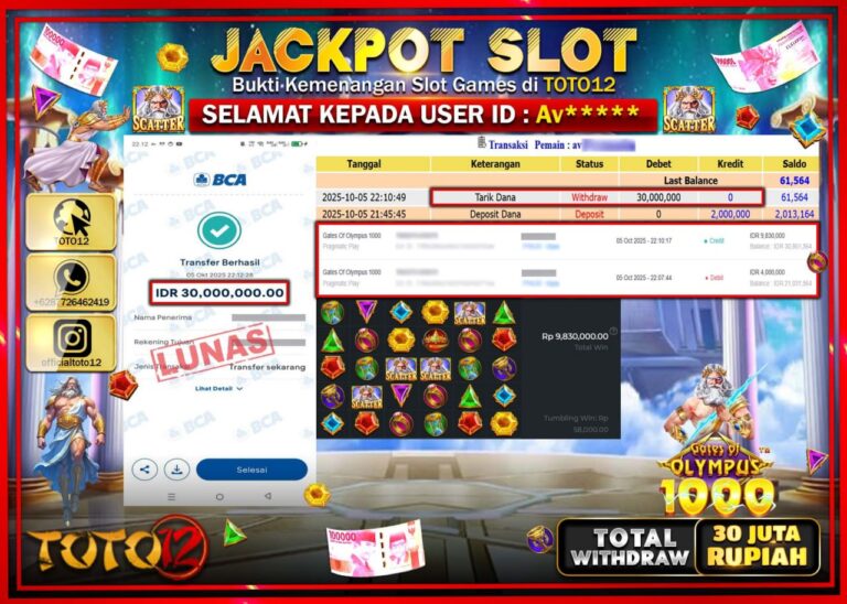 Selamat kepada Member Kami Av****** Telah Jackpot dan berhasil mendapatkan kemenangan besar pada permainan JACKPOT SLOT GAME (GATES OF OLYMPUS 1000) Dengan Kemenangan Sebesar Rp.30.000.000 –. Setelah mengisi Fomulir Withdraw dengan Kurang waktu 1-2 Menit Dana sudah kami Trasnfer kepada Pemilik Userid dan dana sudah dapat di cairkan oleh pemenang. Bukti Pembayaran yang TOTO12 berikan merupakan…