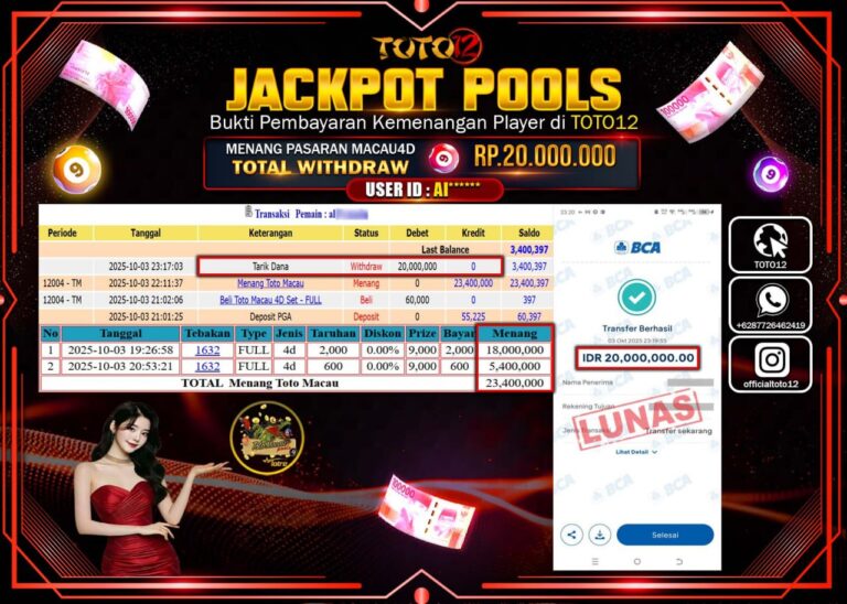 Selamat kepada Member Kami Al****** Telah Jackpot dan berhasil mendapatkan kemenangan besar pada permainan JACKPOT POOLS PASARAN (MACAU 4D) Dengan Kemenangan Sebesar Rp.20.000.000 –. Setelah mengisi Fomulir Withdraw dengan Kurang waktu 1-2 Menit Dana sudah kami Trasnfer kepada Pemilik Userid dan dana sudah dapat di cairkan oleh pemenang. Bukti Pembayaran yang TOTO12 berikan merupakan Bukti Pembayaran…