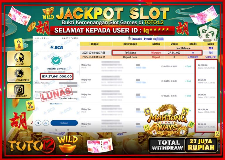 Selamat kepada Member Kami Iq****** Telah Jackpot dan berhasil mendapatkan kemenangan besar pada permainan JACKPOT SLOT GAME (MAHJONG WAYS) Dengan Kemenangan Sebesar Rp.27.641.000 –. Setelah mengisi Fomulir Withdraw dengan Kurang waktu 1-2 Menit Dana sudah kami Trasnfer kepada Pemilik Userid dan dana sudah dapat di cairkan oleh pemenang. Bukti Pembayaran yang TOTO12 berikan merupakan Bukti Pembayaran…
