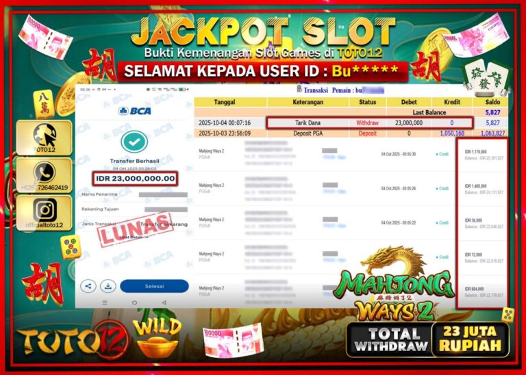 Selamat kepada Member Kami Bu****** Telah Jackpot dan berhasil mendapatkan kemenangan besar pada permainan JACKPOT SLOT GAME (MAHJONG WAYS 2) Dengan Kemenangan Sebesar Rp.23.000.000 –. Setelah mengisi Fomulir Withdraw dengan Kurang waktu 1-2 Menit Dana sudah kami Trasnfer kepada Pemilik Userid dan dana sudah dapat di cairkan oleh pemenang. Bukti Pembayaran yang TOTO12 berikan merupakan Bukti…