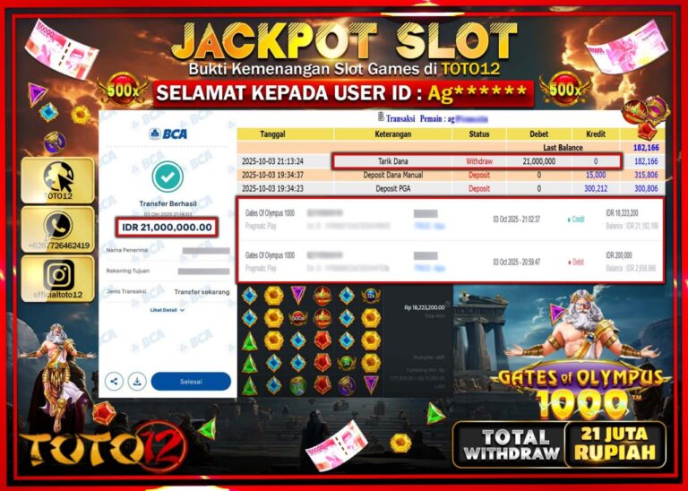 Selamat kepada Member Kami Ag****** Telah Jackpot dan berhasil mendapatkan kemenangan besar pada permainan JACKPOT SLOT GAME (GATES OF OLYMPUS 1000) Dengan Kemenangan Sebesar Rp.21.000.000 –. Setelah mengisi Fomulir Withdraw dengan Kurang waktu 1-2 Menit Dana sudah kami Trasnfer kepada Pemilik Userid dan dana sudah dapat di cairkan oleh pemenang. Bukti Pembayaran yang TOTO12 berikan merupakan…