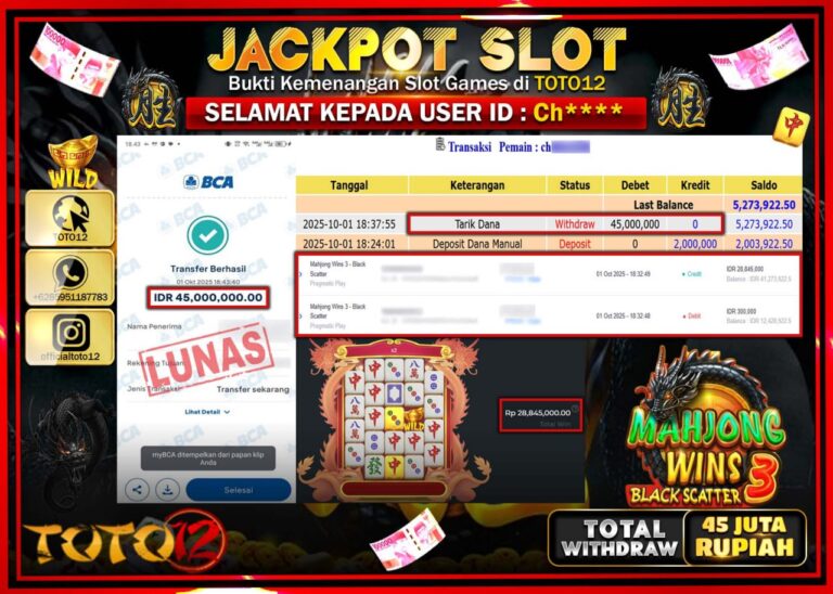 Selamat kepada Member Kami Ch****** Telah Jackpot dan berhasil mendapatkan kemenangan besar pada permainan JACKPOT SLOT GAME (MAHJONG WINS 3 BLACK SCATTER) Dengan Kemenangan Sebesar Rp.45.000.000 –. Setelah mengisi Fomulir Withdraw dengan Kurang waktu 1-2 Menit Dana sudah kami Trasnfer kepada Pemilik Userid dan dana sudah dapat di cairkan oleh pemenang. Bukti Pembayaran yang TOTO12 berikan…