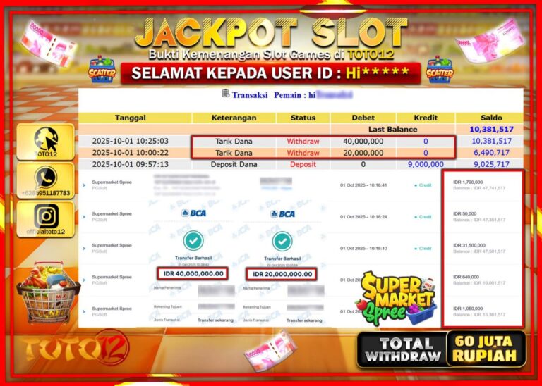 Selamat kepada Member Kami Hi****** Telah Jackpot dan berhasil mendapatkan kemenangan besar pada permainan JACKPOT SLOT GAME (SUPERMARKET SPREE) Dengan Kemenangan Sebesar Rp.60.000.000 –. Setelah mengisi Fomulir Withdraw dengan Kurang waktu 1-2 Menit Dana sudah kami Trasnfer kepada Pemilik Userid dan dana sudah dapat di cairkan oleh pemenang. Bukti Pembayaran yang TOTO12 berikan merupakan Bukti Pembayaran…