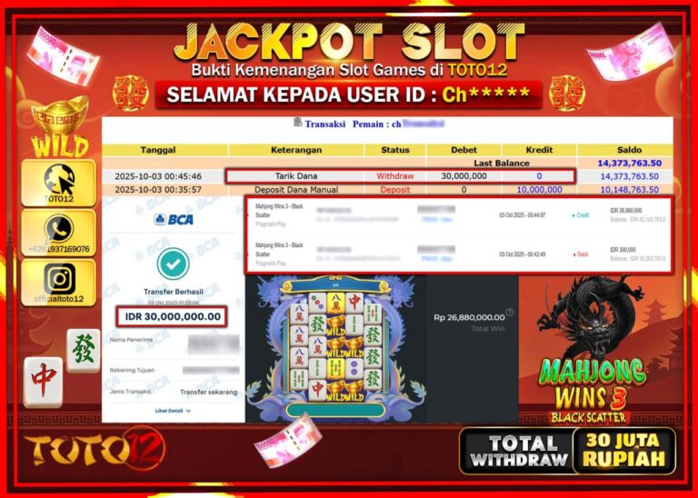 Selamat kepada Member Kami Ch****** Telah Jackpot dan berhasil mendapatkan kemenangan besar pada permainan JACKPOT SLOT GAME (MAHJONG WINS 3 BLACK SCATTER) Dengan Kemenangan Sebesar Rp.30.000.000 –. Setelah mengisi Fomulir Withdraw dengan Kurang waktu 1-2 Menit Dana sudah kami Trasnfer kepada Pemilik Userid dan dana sudah dapat di cairkan oleh pemenang. Bukti Pembayaran yang TOTO12 berikan…