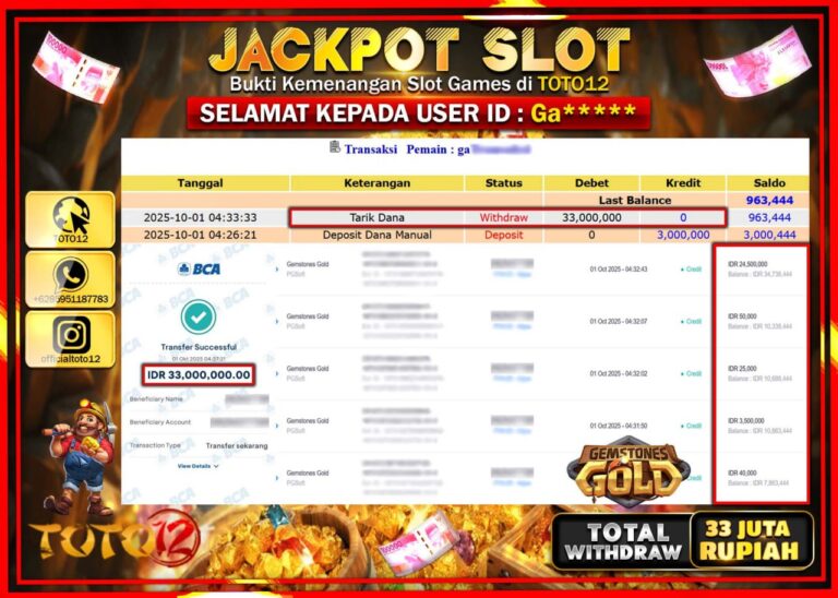 Selamat kepada Member Kami Ga****** Telah Jackpot dan berhasil mendapatkan kemenangan besar pada permainan JACKPOT SLOT GAME (GEMSTONES GOLD) Dengan Kemenangan Sebesar Rp.33.000.000 –. Setelah mengisi Fomulir Withdraw dengan Kurang waktu 1-2 Menit Dana sudah kami Trasnfer kepada Pemilik Userid dan dana sudah dapat di cairkan oleh pemenang. Bukti Pembayaran yang TOTO12 berikan merupakan Bukti Pembayaran…
