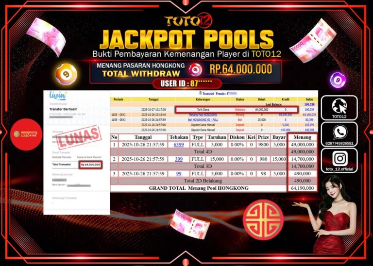 Selamat kepada Member Kami 87****** Telah Jackpot dan berhasil mendapatkan kemenangan besar pada permainan JACKPOT POOLS PASARAN (HONGKONG) Dengan Kemenangan Sebesar Rp.64.000.000 –. Setelah mengisi Fomulir Withdraw dengan Kurang waktu 1-2 Menit Dana sudah kami Trasnfer kepada Pemilik Userid dan dana sudah dapat di cairkan oleh pemenang. Bukti Pembayaran yang TOTO12 berikan merupakan Bukti Pembayaran yang …