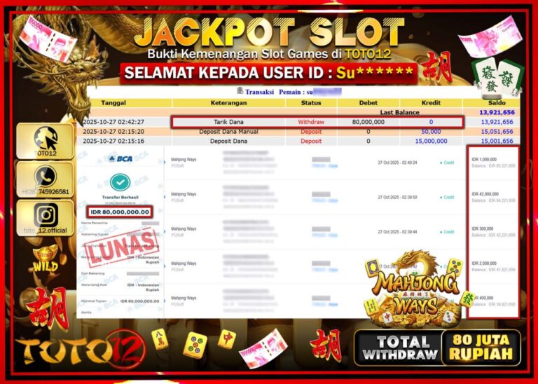 Selamat kepada Member Kami Su****** Telah Jackpot dan berhasil mendapatkan kemenangan besar pada permainan JACKPOT SLOT GAME (MAHJONG WAYS) Dengan Kemenangan Sebesar Rp.80.000.000 –. Setelah mengisi Fomulir Withdraw dengan Kurang waktu 1-2 Menit Dana sudah kami Trasnfer kepada Pemilik Userid dan dana sudah dapat di cairkan oleh pemenang. Bukti Pembayaran yang TOTO12 berikan merupakan Bukti Pembayaran…