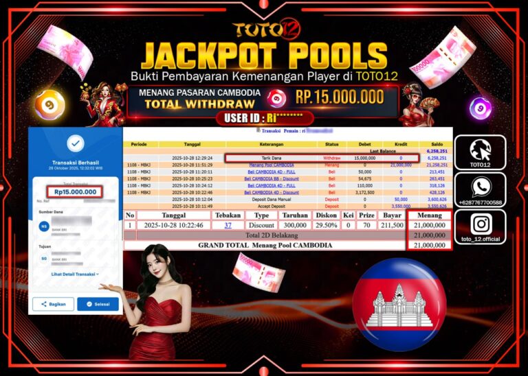 Selamat kepada Member Kami Ri****** Telah Jackpot dan berhasil mendapatkan kemenangan besar pada permainan JACKPOT POOLS PASARAN (CAMBODIA) Dengan Kemenangan Sebesar Rp.15.000.000 –. Setelah mengisi Fomulir Withdraw dengan Kurang waktu 1-2 Menit Dana sudah kami Trasnfer kepada Pemilik Userid dan dana sudah dapat di cairkan oleh pemenang. Bukti Pembayaran yang TOTO12 berikan merupakan Bukti Pembayaran yang …