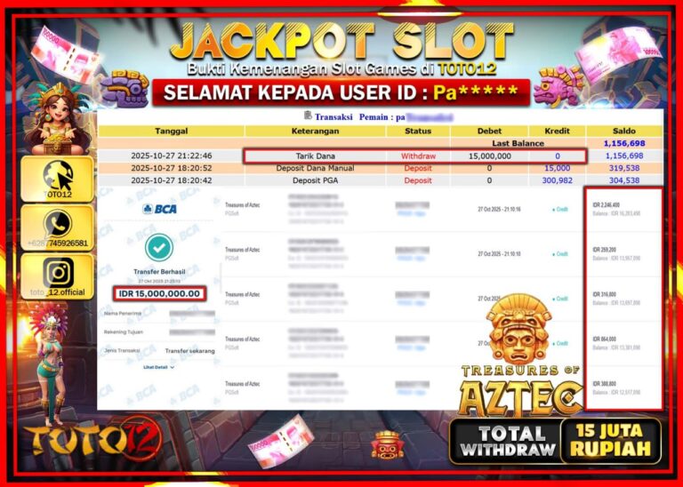 Selamat kepada Member Kami Pa****** Telah Jackpot dan berhasil mendapatkan kemenangan besar pada permainan JACKPOT SLOT GAME (TREASURES OF AZTEC) Dengan Kemenangan Sebesar Rp.15.000.000 –. Setelah mengisi Fomulir Withdraw dengan Kurang waktu 1-2 Menit Dana sudah kami Trasnfer kepada Pemilik Userid dan dana sudah dapat di cairkan oleh pemenang. Bukti Pembayaran yang TOTO12 berikan merupakan Bukti…