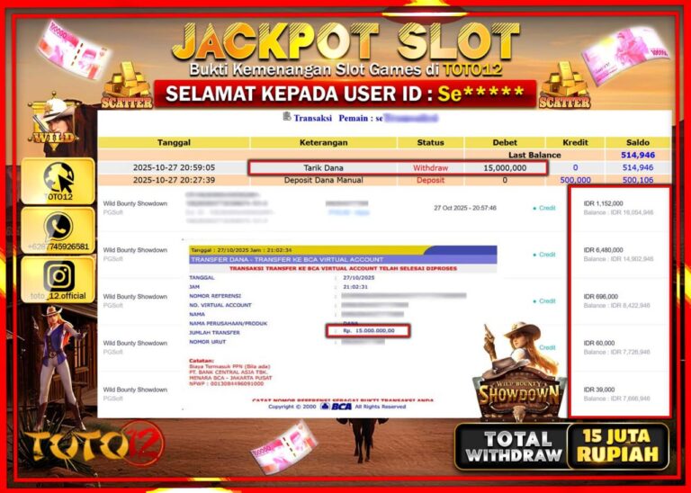 Selamat kepada Member Kami Se****** Telah Jackpot dan berhasil mendapatkan kemenangan besar pada permainan JACKPOT SLOT GAME (WILD BOUNTY SHOWDOWN) Dengan Kemenangan Sebesar Rp.15.000.000 –. Setelah mengisi Fomulir Withdraw dengan Kurang waktu 1-2 Menit Dana sudah kami Trasnfer kepada Pemilik Userid dan dana sudah dapat di cairkan oleh pemenang. Bukti Pembayaran yang TOTO12 berikan merupakan Bukti…