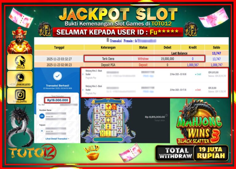 Selamat kepada Member Kami Fu****** Telah Jackpot dan berhasil mendapatkan kemenangan besar pada permainan JACKPOT SLOT GAME (MAHJONG WINS 3 BLACK SCATTER) Dengan Kemenangan Sebesar Rp.19.000.000 –. Setelah mengisi Fomulir Withdraw dengan Kurang waktu 1-2 Menit Dana sudah kami Trasnfer kepada Pemilik Userid dan dana sudah dapat di cairkan oleh pemenang. Bukti Pembayaran yang TOTO12 berikan…