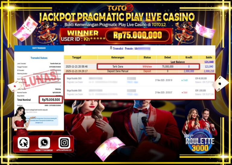 Selamat kepada Member Kami Kh****** Telah Jackpot dan berhasil mendapatkan kemenangan besar pada permainan JACKPOT PRAGMATIC PLAY LIVE CASINO (ROULETTE 3000) Dengan Kemenangan Sebesar Rp.75.000.000 –. Setelah mengisi Fomulir Withdraw dengan Kurang waktu 1-2 Menit Dana sudah kami Trasnfer kepada Pemilik Userid dan dana sudah dapat di cairkan oleh pemenang. Bukti Pembayaran yang TOTO12 berikan merupakan…