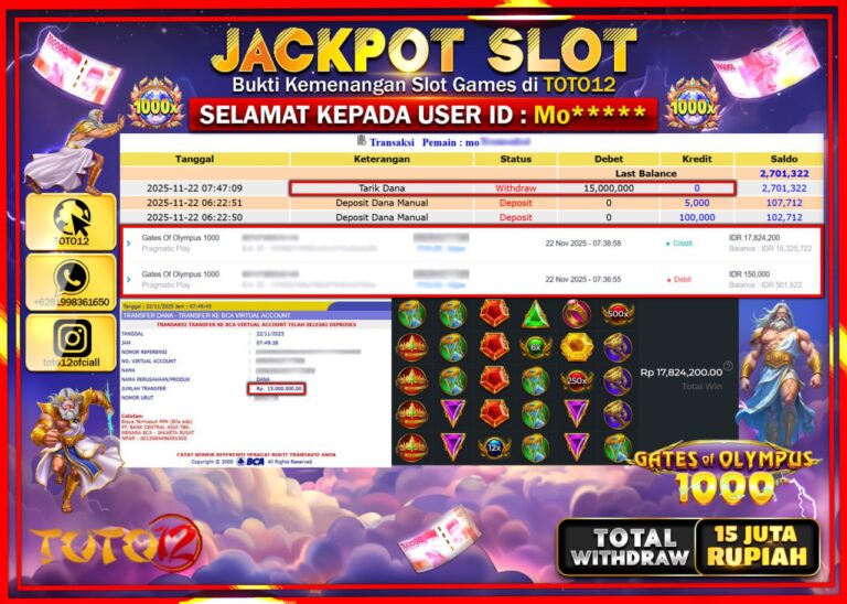 Selamat kepada Member Kami Mo****** Telah Jackpot dan berhasil mendapatkan kemenangan besar pada permainan JACKPOT SLOT GAME (GATES OF OLYMPUS 1000) Dengan Kemenangan Sebesar Rp.15.000.000 –. Setelah mengisi Fomulir Withdraw dengan Kurang waktu 1-2 Menit Dana sudah kami Trasnfer kepada Pemilik Userid dan dana sudah dapat di cairkan oleh pemenang. Bukti Pembayaran yang TOTO12 berikan merupakan…