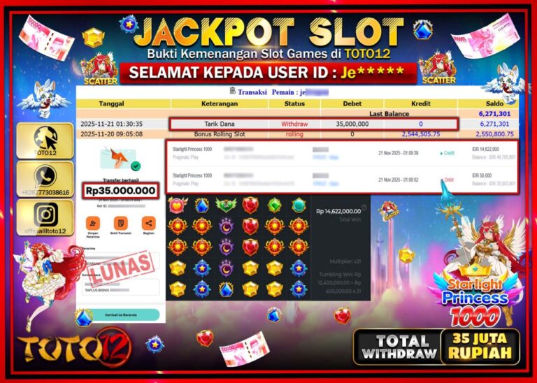 Selamat kepada Member Kami Je****** Telah Jackpot dan berhasil mendapatkan kemenangan besar pada permainan JACKPOT SLOT GAME (STARLIGHT PRINCESS 1000) Dengan Kemenangan Sebesar Rp.35.000.000 –. Setelah mengisi Fomulir Withdraw dengan Kurang waktu 1-2 Menit Dana sudah kami Trasnfer kepada Pemilik Userid dan dana sudah dapat di cairkan oleh pemenang. Bukti Pembayaran yang TOTO12 berikan merupakan Bukti…