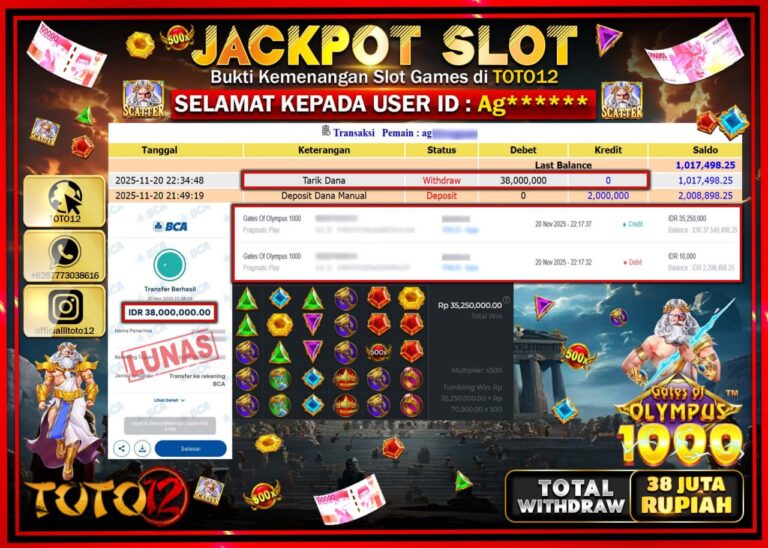 Selamat kepada Member Kami Ag****** Telah Jackpot dan berhasil mendapatkan kemenangan besar pada permainan JACKPOT SLOT GAME (GATES OF OLYMPUS 1000) Dengan Kemenangan Sebesar Rp.38.000.000 –. Setelah mengisi Fomulir Withdraw dengan Kurang waktu 1-2 Menit Dana sudah kami Trasnfer kepada Pemilik Userid dan dana sudah dapat di cairkan oleh pemenang. Bukti Pembayaran yang TOTO12 berikan merupakan…
