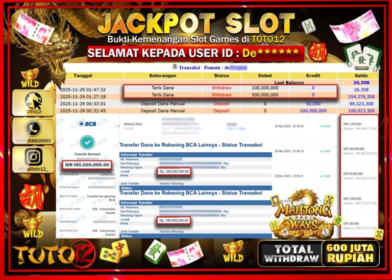 Selamat kepada Member Kami De****** Telah Jackpot dan berhasil mendapatkan kemenangan besar pada permainan JACKPOT SLOT GAME (MAHJONG WAYS) Dengan Kemenangan Sebesar Rp.600.000.000 –. Setelah mengisi Fomulir Withdraw dengan Kurang waktu 1-2 Menit Dana sudah kami Trasnfer kepada Pemilik Userid dan dana sudah dapat di cairkan oleh pemenang. Bukti Pembayaran yang TOTO12 berikan merupakan Bukti Pembayaran…