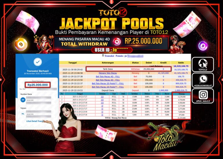 Selamat kepada Member Kami Ju****** Telah Jackpot dan berhasil mendapatkan kemenangan besar pada permainan JACKPOT POOLS PASARAN (MACAU 4D) Dengan Kemenangan Sebesar Rp.25.000.000 –. Setelah mengisi Fomulir Withdraw dengan Kurang waktu 1-2 Menit Dana sudah kami Trasnfer kepada Pemilik Userid dan dana sudah dapat di cairkan oleh pemenang. Bukti Pembayaran yang TOTO12 berikan merupakan Bukti Pembayaran…