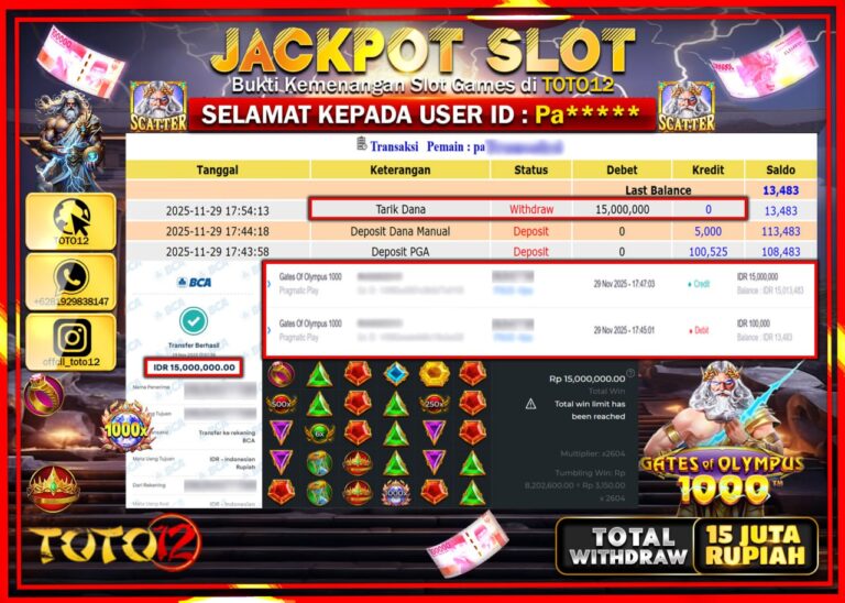 Selamat kepada Member Kami Pa****** Telah Jackpot dan berhasil mendapatkan kemenangan besar pada permainan JACKPOT SLOT GAME (GATES OF OLYMPUS 1000) Dengan Kemenangan Sebesar Rp.15.000.000 –. Setelah mengisi Fomulir Withdraw dengan Kurang waktu 1-2 Menit Dana sudah kami Trasnfer kepada Pemilik Userid dan dana sudah dapat di cairkan oleh pemenang. Bukti Pembayaran yang TOTO12 berikan merupakan…