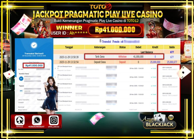 Selamat kepada Member Kami Ah****** Telah Jackpot dan berhasil mendapatkan kemenangan besar pada permainan JACKPOT PRAGMATIC PLAY LIVE CASINO (BLACKJACK) Dengan Kemenangan Sebesar Rp.41.000.000 –. Setelah mengisi Fomulir Withdraw dengan Kurang waktu 1-2 Menit Dana sudah kami Trasnfer kepada Pemilik Userid dan dana sudah dapat di cairkan oleh pemenang. Bukti Pembayaran yang TOTO12 berikan merupakan Bukti…