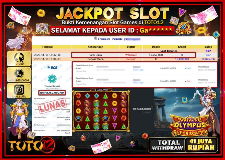 Selamat kepada Member Kami Ga****** Telah Jackpot dan berhasil mendapatkan kemenangan besar pada permainan JACKPOT SLOT GAME (GATES OF OLYMPUS SUPER SCATTER) Dengan Kemenangan Sebesar Rp.41.750.000 –. Setelah mengisi Fomulir Withdraw dengan Kurang waktu 1-2 Menit Dana sudah kami Trasnfer kepada Pemilik Userid dan dana sudah dapat di cairkan oleh pemenang. Bukti Pembayaran yang TOTO12 berikan…