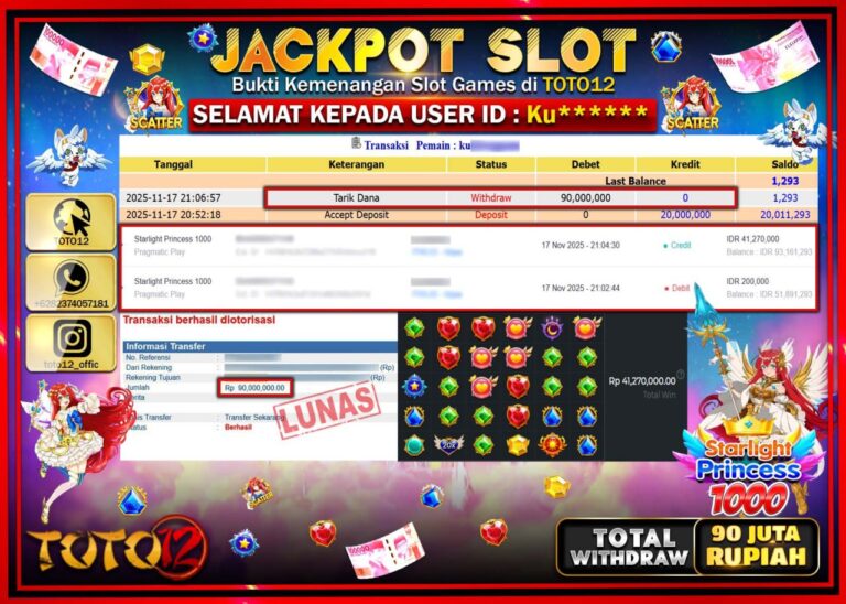 Selamat kepada Member Kami Ku****** Telah Jackpot dan berhasil mendapatkan kemenangan besar pada permainan JACKPOT SLOT GAME (STARLIGHT PRINCESS 1000) Dengan Kemenangan Sebesar Rp.90.000.000 –. Setelah mengisi Fomulir Withdraw dengan Kurang waktu 1-2 Menit Dana sudah kami Trasnfer kepada Pemilik Userid dan dana sudah dapat di cairkan oleh pemenang. Bukti Pembayaran yang TOTO12 berikan merupakan Bukti…