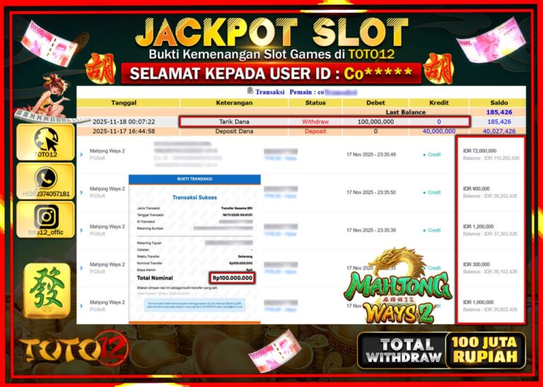 Selamat kepada Member Kami Co****** Telah Jackpot dan berhasil mendapatkan kemenangan besar pada permainan JACKPOT SLOT GAME (MAHJONG WAYS 2) Dengan Kemenangan Sebesar Rp.100.000.000 –. Setelah mengisi Fomulir Withdraw dengan Kurang waktu 1-2 Menit Dana sudah kami Trasnfer kepada Pemilik Userid dan dana sudah dapat di cairkan oleh pemenang. Bukti Pembayaran yang TOTO12 berikan merupakan Bukti…