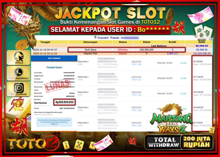 Selamat kepada Member Kami Bo****** Telah Jackpot dan berhasil mendapatkan kemenangan besar pada permainan JACKPOT SLOT GAME (MAHJONG WAYS 2) Dengan Kemenangan Sebesar Rp.200.500.000 –. Setelah mengisi Fomulir Withdraw dengan Kurang waktu 1-2 Menit Dana sudah kami Trasnfer kepada Pemilik Userid dan dana sudah dapat di cairkan oleh pemenang. Bukti Pembayaran yang TOTO12 berikan merupakan Bukti…