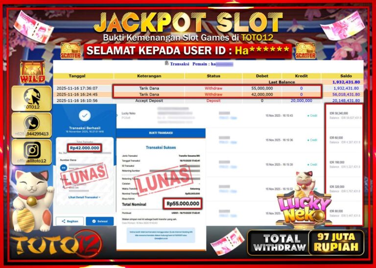 Selamat kepada Member Kami Ha****** Telah Jackpot dan berhasil mendapatkan kemenangan besar pada permainan JACKPOT SLOT GAME (LUCKY NEKO) Dengan Kemenangan Sebesar Rp.97.000.000 –. Setelah mengisi Fomulir Withdraw dengan Kurang waktu 1-2 Menit Dana sudah kami Trasnfer kepada Pemilik Userid dan dana sudah dapat di cairkan oleh pemenang. Bukti Pembayaran yang TOTO12 berikan merupakan Bukti Pembayaran…