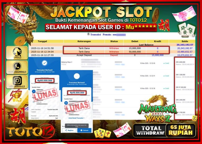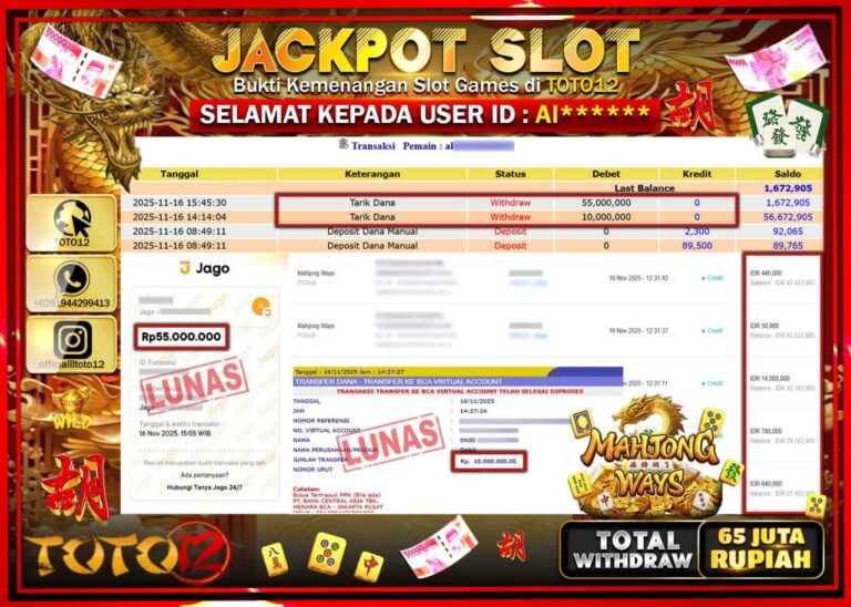 Selamat kepada Member Kami Al****** Telah Jackpot dan berhasil mendapatkan kemenangan besar pada permainan JACKPOT SLOT GAME (MAHJONG WAYS) Dengan Kemenangan Sebesar Rp.65.000.000 –. Setelah mengisi Fomulir Withdraw dengan Kurang waktu 1-2 Menit Dana sudah kami Trasnfer kepada Pemilik Userid dan dana sudah dapat di cairkan oleh pemenang. Bukti Pembayaran yang TOTO12 berikan merupakan Bukti Pembayaran…
