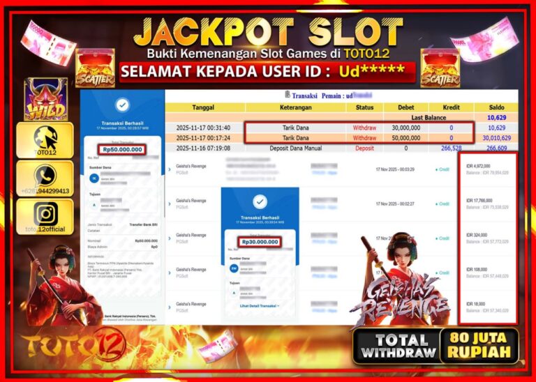 Selamat kepada Member Kami Ud****** Telah Jackpot dan berhasil mendapatkan kemenangan besar pada permainan JACKPOT SLOT GAME (GEISHAS REVENGE) Dengan Kemenangan Sebesar Rp.80.000.000 –. Setelah mengisi Fomulir Withdraw dengan Kurang waktu 1-2 Menit Dana sudah kami Trasnfer kepada Pemilik Userid dan dana sudah dapat di cairkan oleh pemenang. Bukti Pembayaran yang TOTO12 berikan merupakan Bukti Pembayaran…
