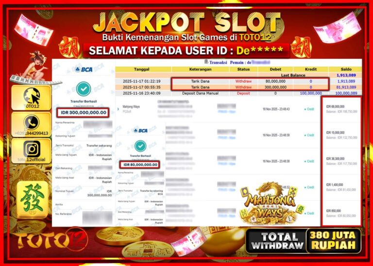 Selamat kepada Member Kami De****** Telah Jackpot dan berhasil mendapatkan kemenangan besar pada permainan JACKPOT SLOT GAME (MAHJONG WAYS) Dengan Kemenangan Sebesar Rp.380.000.000 –. Setelah mengisi Fomulir Withdraw dengan Kurang waktu 1-2 Menit Dana sudah kami Trasnfer kepada Pemilik Userid dan dana sudah dapat di cairkan oleh pemenang. Bukti Pembayaran yang TOTO12 berikan merupakan Bukti Pembayaran…