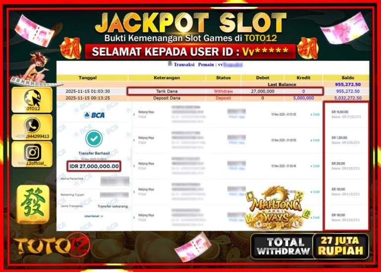 Selamat kepada Member Kami Vv****** Telah Jackpot dan berhasil mendapatkan kemenangan besar pada permainan JACKPOT SLOT GAME (MAHJONG WAYS) Dengan Kemenangan Sebesar Rp.27.000.000 –. Setelah mengisi Fomulir Withdraw dengan Kurang waktu 1-2 Menit Dana sudah kami Trasnfer kepada Pemilik Userid dan dana sudah dapat di cairkan oleh pemenang. Bukti Pembayaran yang TOTO12 berikan merupakan Bukti Pembayaran…