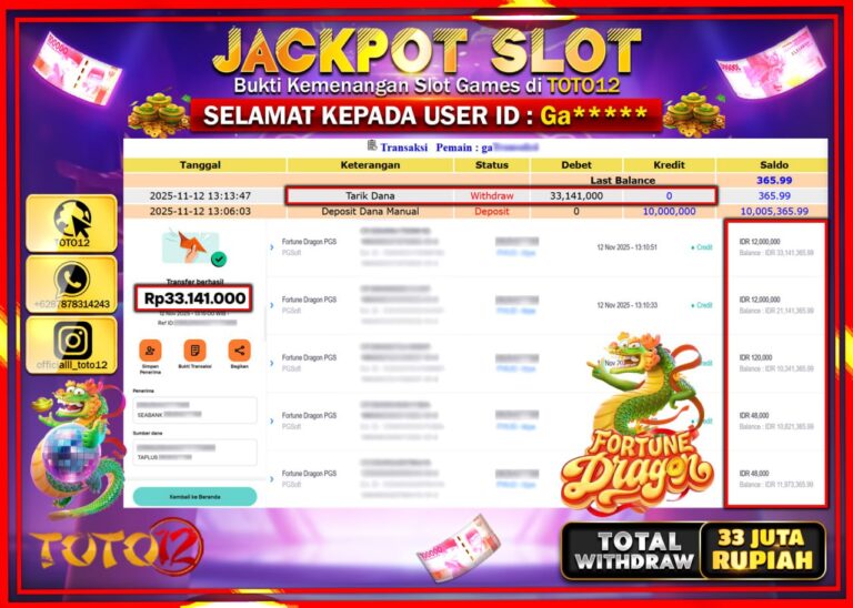 Selamat kepada Member Kami Ga****** Telah Jackpot dan berhasil mendapatkan kemenangan besar pada permainan JACKPOT SLOT GAME (FORTUNE DRAGON) Dengan Kemenangan Sebesar Rp.33.141.000 –. Setelah mengisi Fomulir Withdraw dengan Kurang waktu 1-2 Menit Dana sudah kami Trasnfer kepada Pemilik Userid dan dana sudah dapat di cairkan oleh pemenang. Bukti Pembayaran yang TOTO12 berikan merupakan Bukti Pembayaran…