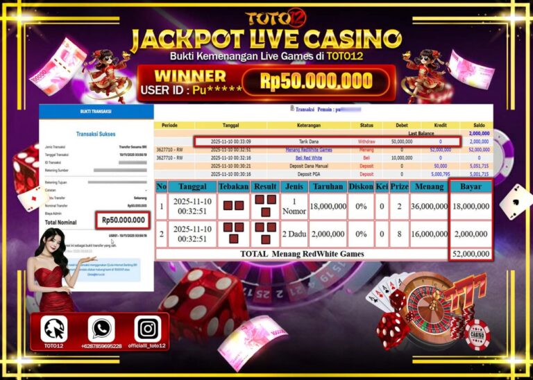 Selamat kepada Member Kami Pu****** Telah Jackpot dan berhasil mendapatkan kemenangan besar pada permainan JACKPOT LIVE CASINO (REDWHITE GAMES) Dengan Kemenangan Sebesar Rp.50.000.000 –. Setelah mengisi Fomulir Withdraw dengan Kurang waktu 1-2 Menit Dana sudah kami Trasnfer kepada Pemilik Userid dan dana sudah dapat di cairkan oleh pemenang. Bukti Pembayaran yang TOTO12 berikan merupakan Bukti Pembayaran…