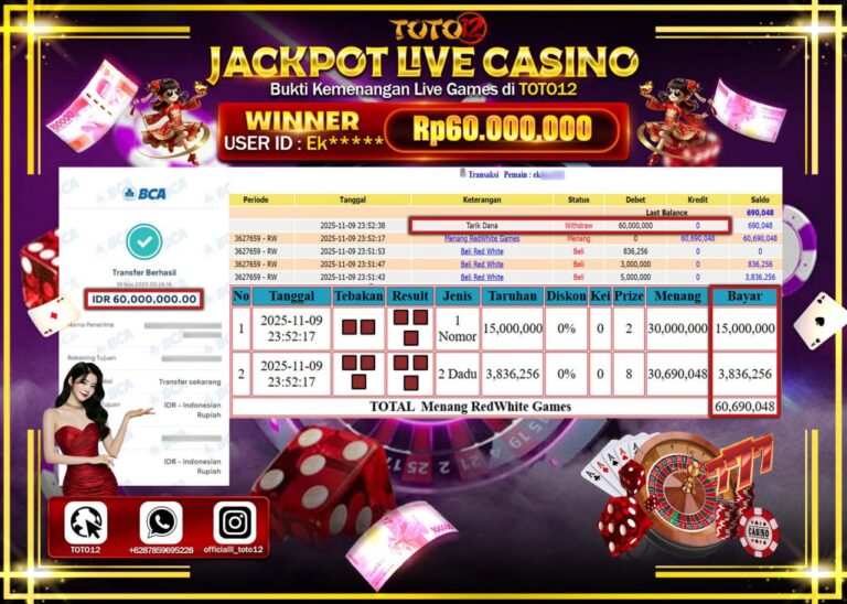 Selamat kepada Member Kami Ek****** Telah Jackpot dan berhasil mendapatkan kemenangan besar pada permainan JACKPOT LIVE CASINO (REDWHITE GAMES) Dengan Kemenangan Sebesar Rp.60.000.000 –. Setelah mengisi Fomulir Withdraw dengan Kurang waktu 1-2 Menit Dana sudah kami Trasnfer kepada Pemilik Userid dan dana sudah dapat di cairkan oleh pemenang. Bukti Pembayaran yang TOTO12 berikan merupakan Bukti Pembayaran…