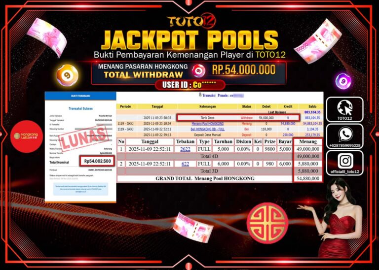 Selamat kepada Member Kami Co****** Telah Jackpot dan berhasil mendapatkan kemenangan besar pada permainan JACKPOT POOLS PASARAN (HONGKONG) Dengan Kemenangan Sebesar Rp.54.000.000 –. Setelah mengisi Fomulir Withdraw dengan Kurang waktu 1-2 Menit Dana sudah kami Trasnfer kepada Pemilik Userid dan dana sudah dapat di cairkan oleh pemenang. Bukti Pembayaran yang TOTO12 berikan merupakan Bukti Pembayaran yang …