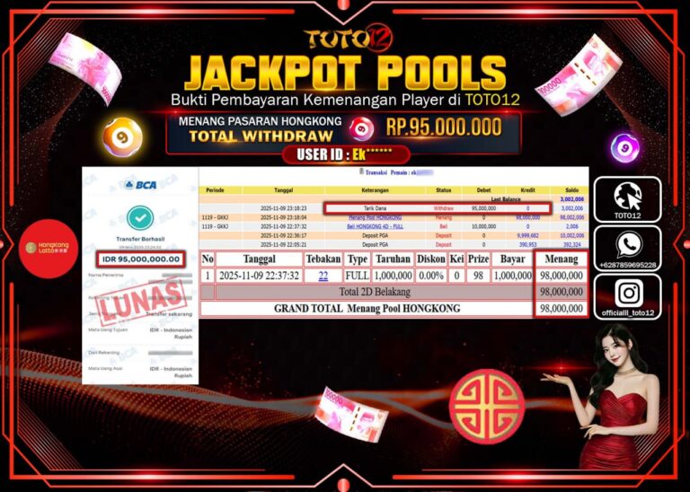 Selamat kepada Member Kami Ek****** Telah Jackpot dan berhasil mendapatkan kemenangan besar pada permainan JACKPOT POOLS PASARAN (HONGKONG) Dengan Kemenangan Sebesar Rp.95.000.000 –. Setelah mengisi Fomulir Withdraw dengan Kurang waktu 1-2 Menit Dana sudah kami Trasnfer kepada Pemilik Userid dan dana sudah dapat di cairkan oleh pemenang. Bukti Pembayaran yang TOTO12 berikan merupakan Bukti Pembayaran yang …