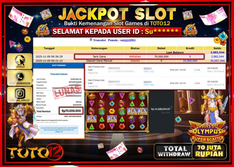 Selamat kepada Member Kami Su****** Telah Jackpot dan berhasil mendapatkan kemenangan besar pada permainan JACKPOT SLOT GAME (GATES OF OLYMPUS SUPER SCATTER) Dengan Kemenangan Sebesar Rp.70.000.000 –. Setelah mengisi Fomulir Withdraw dengan Kurang waktu 1-2 Menit Dana sudah kami Trasnfer kepada Pemilik Userid dan dana sudah dapat di cairkan oleh pemenang. Bukti Pembayaran yang TOTO12 berikan…