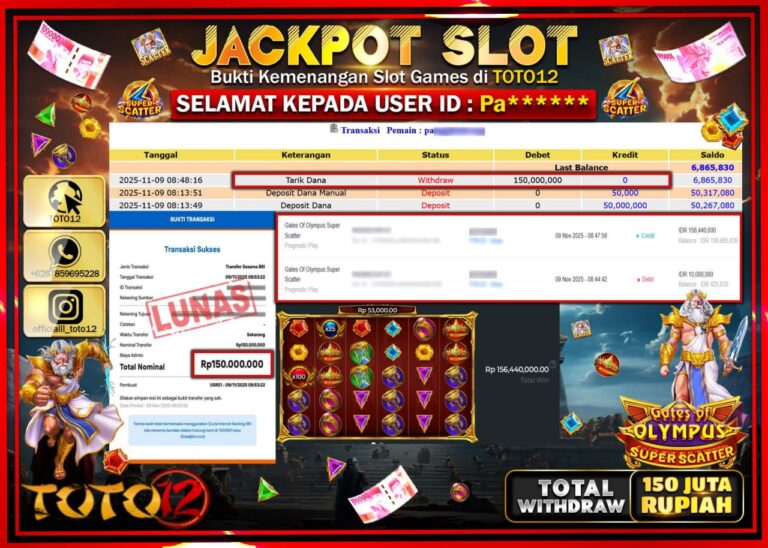 Selamat kepada Member Kami Pa****** Telah Jackpot dan berhasil mendapatkan kemenangan besar pada permainan JACKPOT SLOT GAME (GATES OF OLYMPUS SUPER SCATTER) Dengan Kemenangan Sebesar Rp.150.000.000 –. Setelah mengisi Fomulir Withdraw dengan Kurang waktu 1-2 Menit Dana sudah kami Trasnfer kepada Pemilik Userid dan dana sudah dapat di cairkan oleh pemenang. Bukti Pembayaran yang TOTO12 berikan…