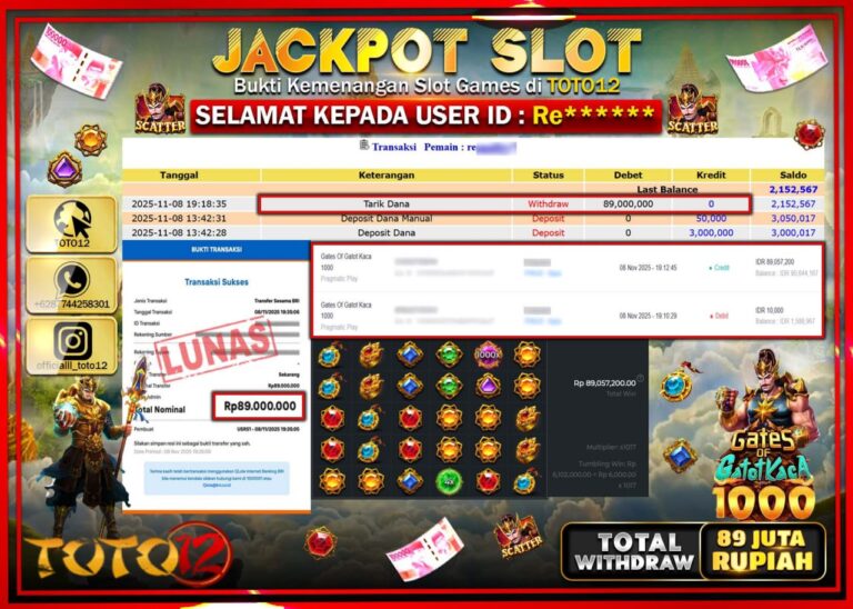 Selamat kepada Member Kami Re****** Telah Jackpot dan berhasil mendapatkan kemenangan besar pada permainan JACKPOT SLOT GAME (GATES OF GATOT KACA 1000) Dengan Kemenangan Sebesar Rp.89.000.000 –. Setelah mengisi Fomulir Withdraw dengan Kurang waktu 1-2 Menit Dana sudah kami Trasnfer kepada Pemilik Userid dan dana sudah dapat di cairkan oleh pemenang. Bukti Pembayaran yang TOTO12 berikan…
